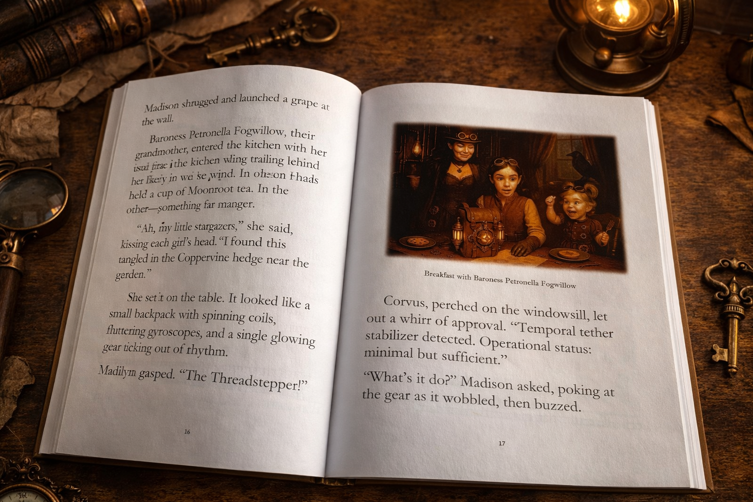 Step into the imaginative, steam-powered world of Whimbrassel, where invention, courage, and curiosity intertwine! This beautifully bound hardcover Steampunk adventure features rich, full-color illustrations on premium paper, bringing to life the story of Madilynn and Madison Gearwyn as they race to rescue their grandfather, Professor Thaddeus Cogglepotts, from the mysterious Chronoglass — a time-bending mirror that holds both secrets and dangers.